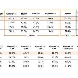 - Python: Evaluated using HumanEval pass@1, MBPP sanitized pass@1, CruxEval, and RepoBench EM, showcasing superior code generation and repository-level completion.