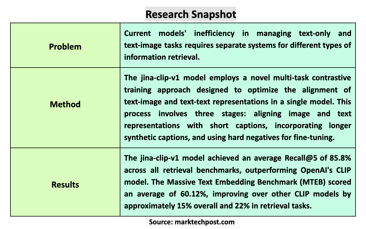 Jina AI Researchers introduced the Jina-clip-v1 model to solve these challenges. This open-sourced model employs a novel multi-task contrastive training approach designed to optimize the alignment of text-image and text-text representations within a single model. This method aims to unify the capabilities of handling both types of tasks effectively, reducing the need for separate models.