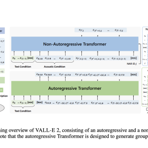 VALL-E 2 uses a two-stage approach involving autoregressive (AR) and non-autoregressive (NAR) models. The AR model predicts a sequence of codec codes using nucleus sampling with repetition-aware techniques, ensuring stability and diversity in speech output. The NAR model generates the remaining codes, improving efficiency and robustness. Repetition-aware sampling adaptively employs random or nucleus sampling for each token prediction based on the token’s repetition in the decoding history. Grouped code modeling partitions codec codes into groups, each modeled as a single frame, reducing sequence length and enhancing performance.