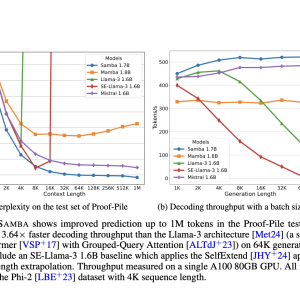 Researchers from Microsoft and the University of Illinois at Urbana-Champaign present SAMBA, a simple neural architecture that harmonizes the strengths of both the SSM and the attention-based models achieving unlimited sequence length extrapolation with linear time complexity. SAMBA’s architecture interleaves Mamba, SwiGLU, and Sliding Window Attention (SWA) layers. Mamba layers capture time-dependent semantics and enable efficient decoding, while SWA models complex, non-Markovian dependencies. The researchers have scaled SAMBA to various sizes, with the largest 3.8B parameter model pre-trained on 3.2T tokens. This model demonstrates impressive performance on benchmarks like MMLU, HumanEval, and GSM8K, outperforming other open-source language models up to 8B parameters.