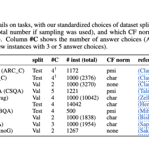 OLMES standardizes the evaluation process by specifying detailed guidelines for dataset processing, prompt formatting, in-context examples, probability normalization, and task formulation. For instance, OLMES recommends using consistent prefixes and suffixes in prompts, such as “Question:” and “Answer:”, to clarify tasks naturally. The standard also involves manually curating five-shot examples for each task, ensuring high-quality and balanced examples that cover the label space effectively. Furthermore, OLMES specifies using different normalization methods, such as pointwise mutual information (PMI) normalization, for certain tasks to adjust for the inherent likelihood of answer choices. OLMES aims to make the evaluation process transparent and reproducible by addressing these factors.