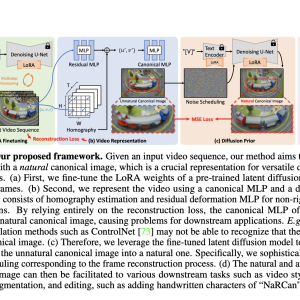The method improves the model’s capability to manage complicated video dynamics by using ‘homography ‘, a technique for representing global motion, and ‘multi-layer perceptrons (MLPs) ‘, a type of neural network, to record local residual deformations. This model’s advantage over existing canonical-based methods is that it incorporates a diffusion to the early stages of training. This guarantees that the generated images maintain a high-quality natural appearance, making the canonical images suitable for various downstream tasks in video editing. In addition, we implement a noise and diffusion prior update scheduling method and fine-tune low-rank adaptation (LoRA), which speeds up training by a factor of fourteen.