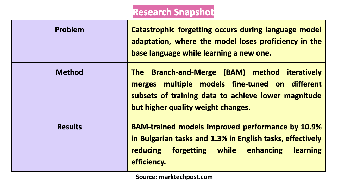 The post Branch-and-Merge Method: Enhancing Language Adaptation in AI Models by Mitigating Catastrophic Forgetting and Ensuring Retention of Base Language Capabilities while Learning New Languages appeared first on MarkTechPost.