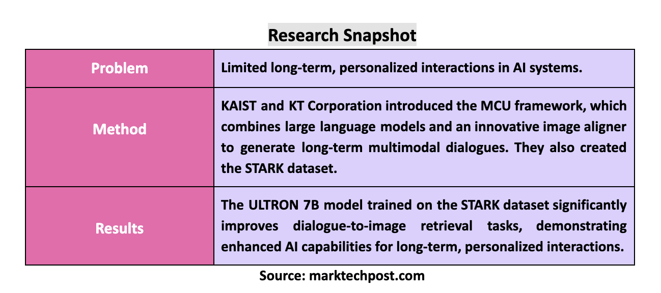 The post Researchers from KAIST and KT Corporation Developed STARK Dataset and MCU Framework: Long-Term Personalized Interactions and Enhanced User Engagement in Multimodal Conversations appeared first on MarkTechPost.