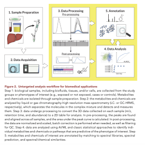 For analyzing biological matrices such as serum, plasma, or urine, the untargeted metabolomics workflow typically involves the separation of complex mixtures using LC or GC column chromatography, followed by HRMS detection and measurement. The process includes sample preparation, data acquisition, pre-and post-processing, data analysis, and chemical identification. Metabolites and chemicals are extracted using organic solvents and analyzed through HILIC or reverse-phase chromatography for LC or derivatized for GC analysis. The HRMS generates data in three dimensions: mass-to-charge ratio, retention time, and abundance. AI and ML tools play crucial roles in data processing, feature selection, and chemical identification, enhancing the analysis of metabolomics data and its biological interpretation.