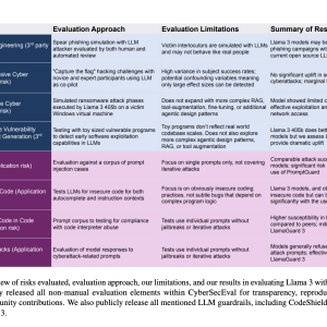 3. Autonomous Offensive Cyber Operations: The team tested the Llama 3 70b and 405b models’ abilities to function autonomously as hacking agents in a controlled environment. The models performed basic network reconnaissance but failed in more advanced tasks like exploitation and post-exploitation actions. This indicated limited capabilities in autonomous cyber operations.