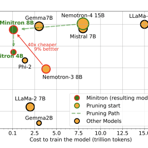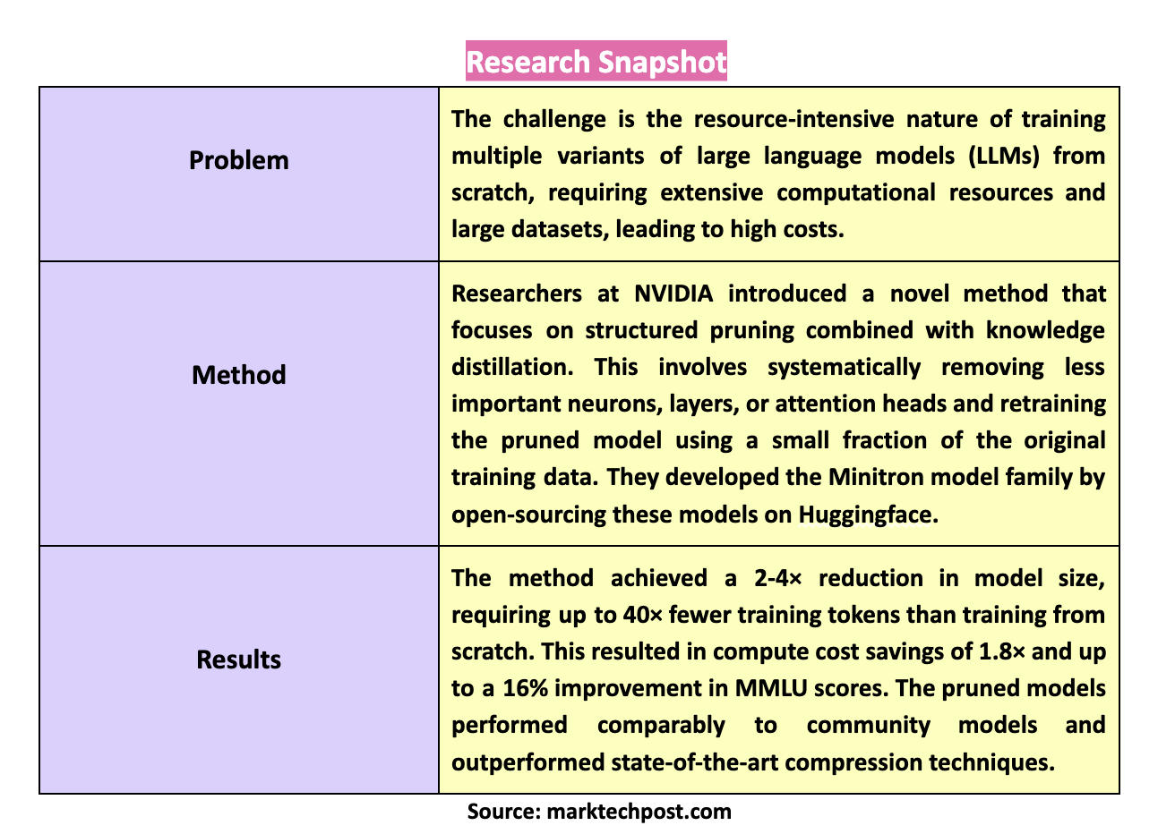 Researchers at NVIDIA have introduced a novel approach to prune and retrain LLMs efficiently. Their method focuses on structured pruning, systematically removing entire neurons, layers, or attention heads based on their calculated importance. This approach is combined with a knowledge distillation process, allowing the pruned model to be retrained using a small fraction of the original training data. This method aims to retain the performance of the original model while significantly reducing the training cost and time. The researchers have developed the Minitron model family and have open-sourced these models on Huggingface for public use.