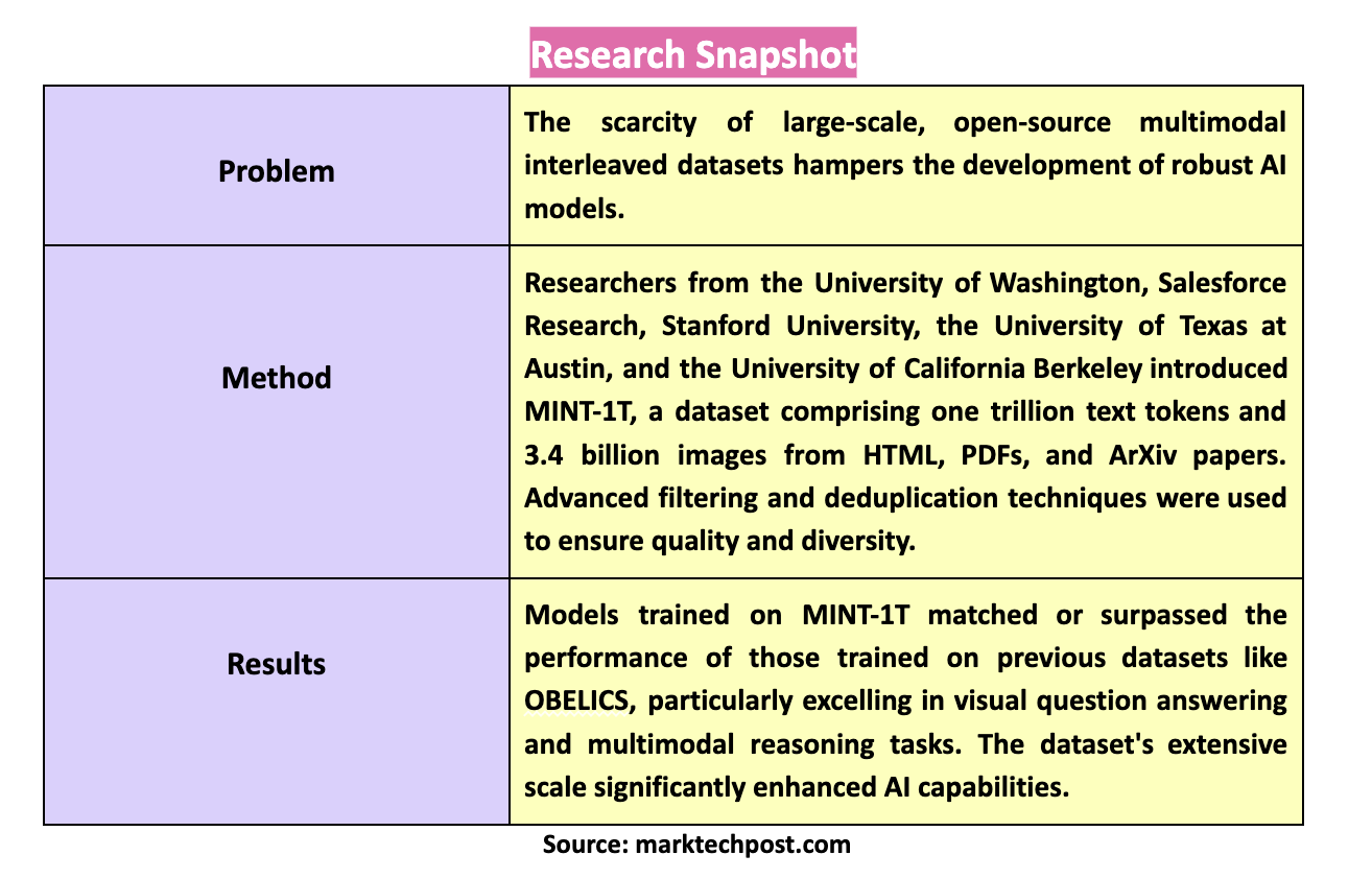 Researchers from the University of Washington, Salesforce Research, Stanford University, the University of Texas at Austin, and the University of California Berkeley introduced MINT-1T, the most extensive & diverse open-source multimodal interleaved dataset to date, addressing the need for larger and more varied datasets. MINT-1T comprises one trillion text tokens and 3.4 billion images from HTML, PDFs, and ArXiv papers. This dataset represents a tenfold increase from previous datasets, significantly enhancing the data for training multimodal models. Institutions such as the University of Washington and Salesforce Research collaborated on this initiative, demonstrating a concerted effort to bridge the gap in dataset availability.