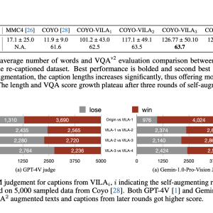 In conclusion, VILA 2 represents a significant leap forward in visual language models, achieving state-of-the-art performance through innovative self-augmentation and specialist-augmentation techniques. By iteratively refining pretraining data using only publicly available datasets, the model demonstrates superior caption quality, reduced hallucinations, and improved accuracy across various visual-language tasks. The combination of generalist knowledge with domain-specific expertise results in significant performance boosts across benchmarks. VILA 2’s success highlights the potential of data-centric improvements in advancing multi-modal AI systems, paving the way for more sophisticated visual and textual information understanding. This approach not only enhances model performance but also showcases the effectiveness of leveraging existing models to improve data quality, potentially revolutionizing the development of future AI systems.
