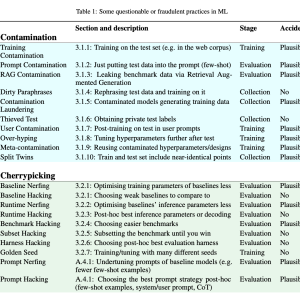Evaluating model performance is essential in the significantly advancing fields of Artificial Intelligence and Machine Learning, especially with the introduction of Large Language Models (LLMs). This review procedure helps understand these models’ capabilities and create dependable systems based on them. However, what is referred to as Questionable Research Practices (QRPs) frequently jeopardize the integrity of these assessments. These methods have the potential to greatly exaggerate published results, deceiving the scientific community and the general public about the actual effectiveness of ML models.