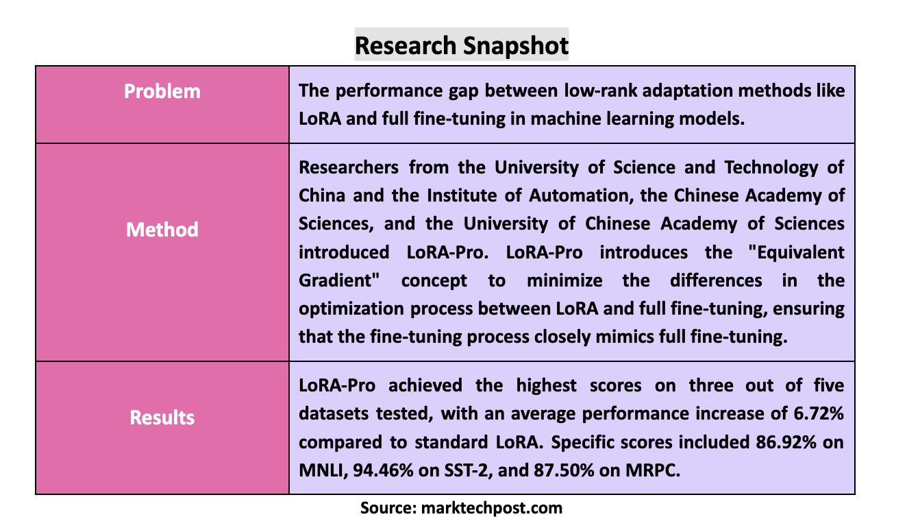 Researchers from the University of Science and Technology of China and the Institute of Automation, the Chinese Academy of Sciences, and the University of Chinese Academy of Sciences introduced LoRA-Pro. This novel method bridges the performance gap between LoRA and full fine-tuning. LoRA-Pro enhances LoRA’s optimization process by introducing the “Equivalent Gradient.” This concept allows the researchers to measure the differences in the optimization process between LoRA and full fine-tuning and then minimize these differences to improve performance. By doing so, LoRA-Pro ensures that the fine-tuning process closely mimics full fine-tuning.