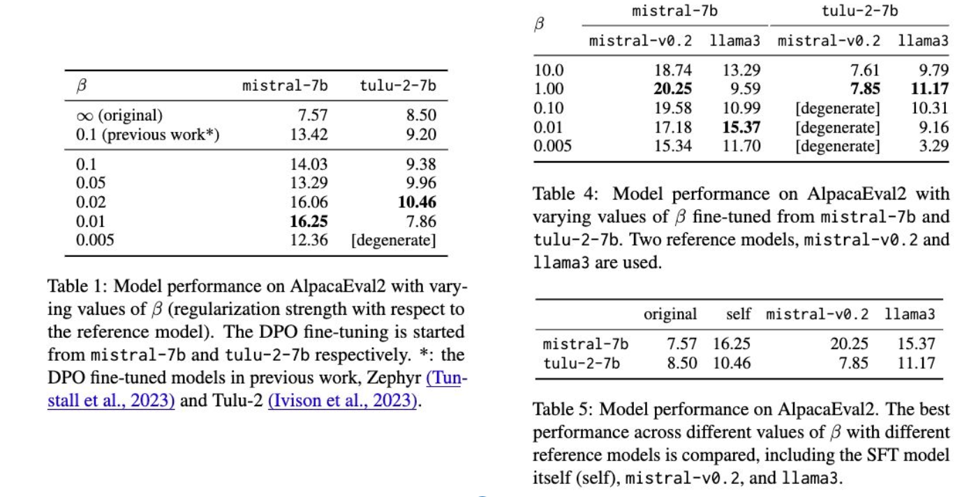 The study found significant results regarding the impact of the KL-divergence constraint on DPO performance. A smaller constraint typically led to better performance, with the optimal value of β being around 0.01 to 0.02. For example, the model fine-tuned from Mistral-7b achieved an AlpacaEval2 score of 16.25 with a β of 0.01, compared to the original score of 7.57 without DPO. The analysis showed that reducing the constraint strength improved performance until it became too small, at which point the model’s performance degraded. Furthermore, stronger reference models, like Mistral-v0.2 and Llama-3-70b, provided additional benefits, but only when compatible with the fine-tuned model. The study highlighted the importance of selecting an appropriate reference policy to achieve optimal results.