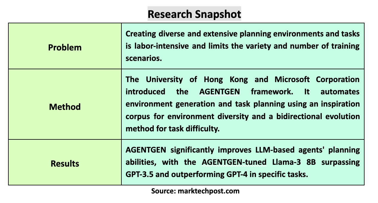 The research team from the University of Hong Kong and Microsoft Corporation has proposed a novel framework named AGENTGEN, which utilizes LLMs to automate the generation of environments and their corresponding planning tasks. This innovative approach involves two primary stages: environment generation and task generation. Initially, the framework uses an inspiration corpus comprising diverse text segments to create detailed and varied environment specifications. Following this, AGENTGEN generates related planning tasks that range from simple to complex, ensuring a smooth progression of difficulty and facilitating effective learning for the LLMs.