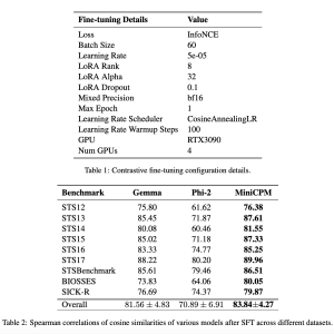 Experiments focus on measuring the similarity score of embeddings for sentence pairs using cosine similarity and Spearman correlations. MiniCPM, Gemma, and Phi-2 are evaluated across nine benchmarks, including STS12-17, STSBenchmark, BIOSSES, and SICK-R. Results show that MiniCPM consistently outperforms the other models, achieving the highest Spearman correlations across all datasets. Fine-tuning with LoRA significantly enhances performance, with MiniCPM showing a 56-point improvement. Ablation studies reveal the impact of learning rate, prompting, and hard negatives on performance, indicating that MiniCPM benefits greatly from contrastive fine-tuning and hard negative penalization.