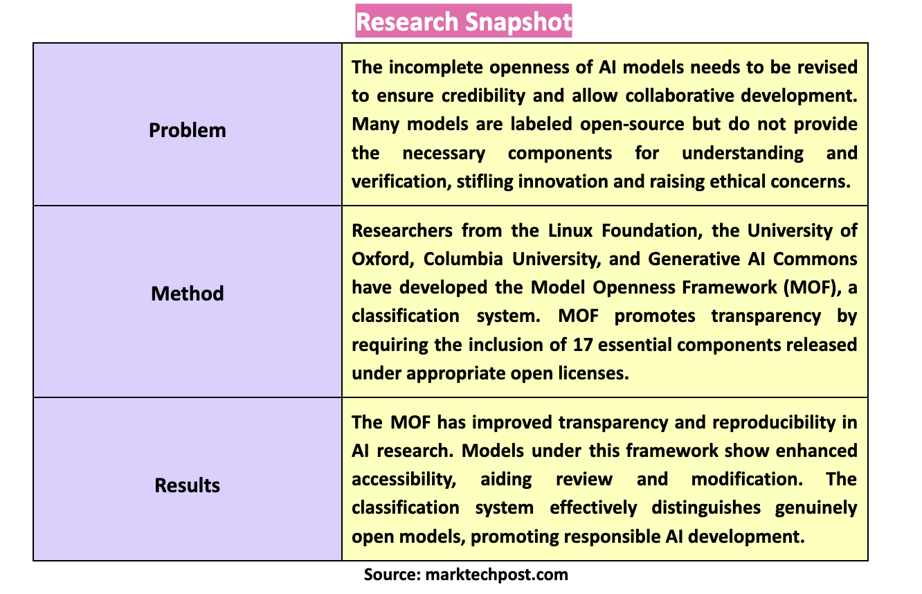 Researchers from the Linux Foundation, the University of Oxford, Columbia University, and Generative AI Commons have developed the Model Openness Framework (MOF), a comprehensive system designed to promote transparency and reproducibility in AI model development. The MOF provides a classification system that ranks AI models based on completeness and openness. This framework requires including all components in the model development lifecycle and mandates that they be released under appropriate open licenses, thus ensuring full transparency.