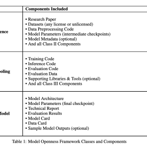 The MOF also introduces a classification system with three levels: Class I, Class II, and Class III. Class III, the entry level, includes core components such as the model architecture and final parameters, along with basic documentation and evaluation results. Class II builds on this by adding full training and inference code, benchmark tests, and supporting libraries. Class I, the highest level, aligns with the ideals of open science by requiring a detailed research paper, raw training datasets, and comprehensive log files. This tiered approach guides model producers in progressively enhancing the completeness and openness of their releases.