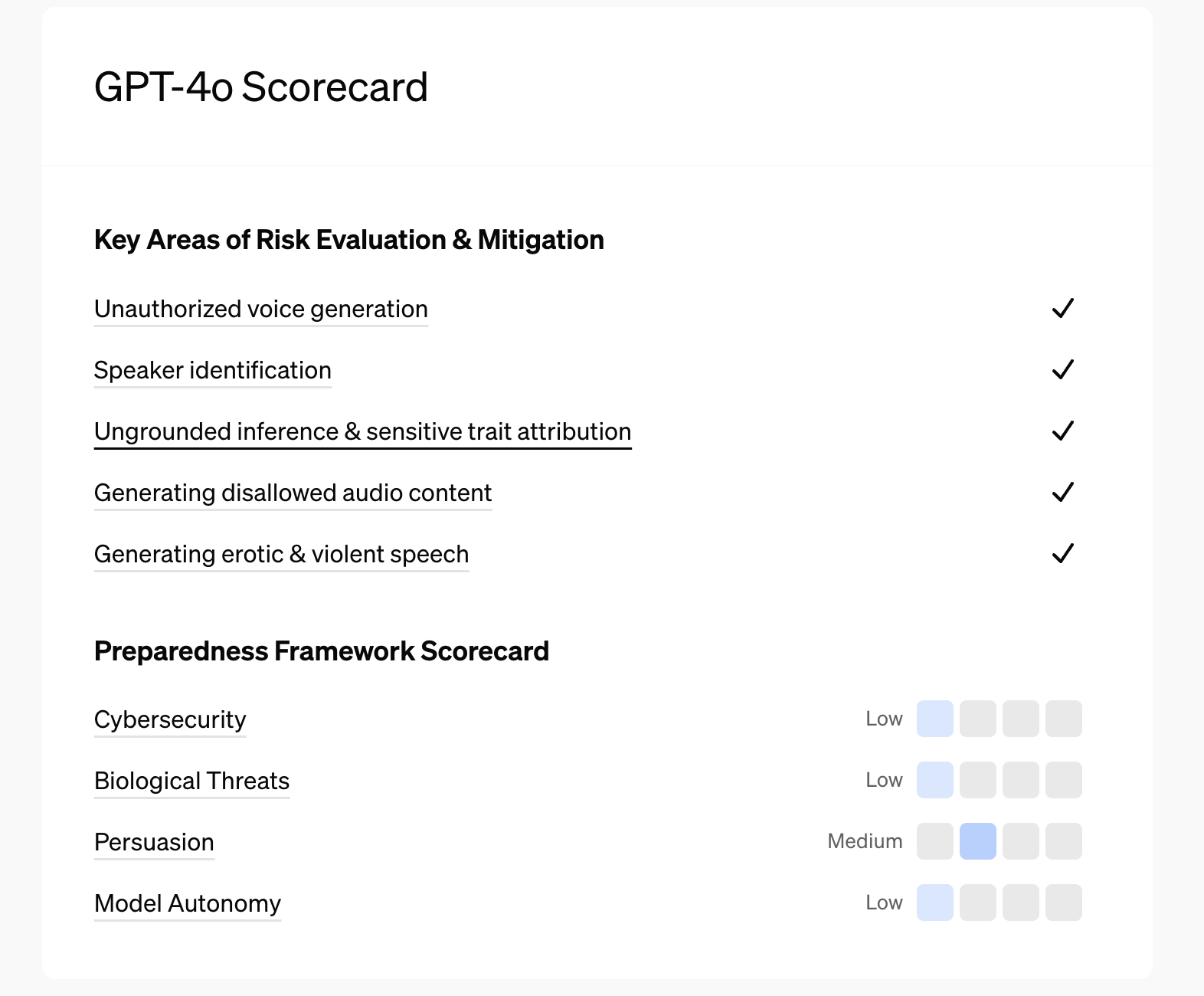 To address these challenges, OpenAI introduced the GPT-4o System Card, offering a comprehensive overview of GPT-4o’s capabilities, limitations, and safety evaluations. This document outlines the preparedness framework for assessing the model’s safety, including evaluations of its speech-to-speech capabilities, text and image processing, and potential societal impacts. The System Card marks a step forward in transparency and safety for AI models, providing detailed insights into the safeguards and evaluations that underpin the deployment of GPT-4o. It guides understanding GPT-4o’s operation and the measures taken to ensure alignment with ethical standards and safety protocols.