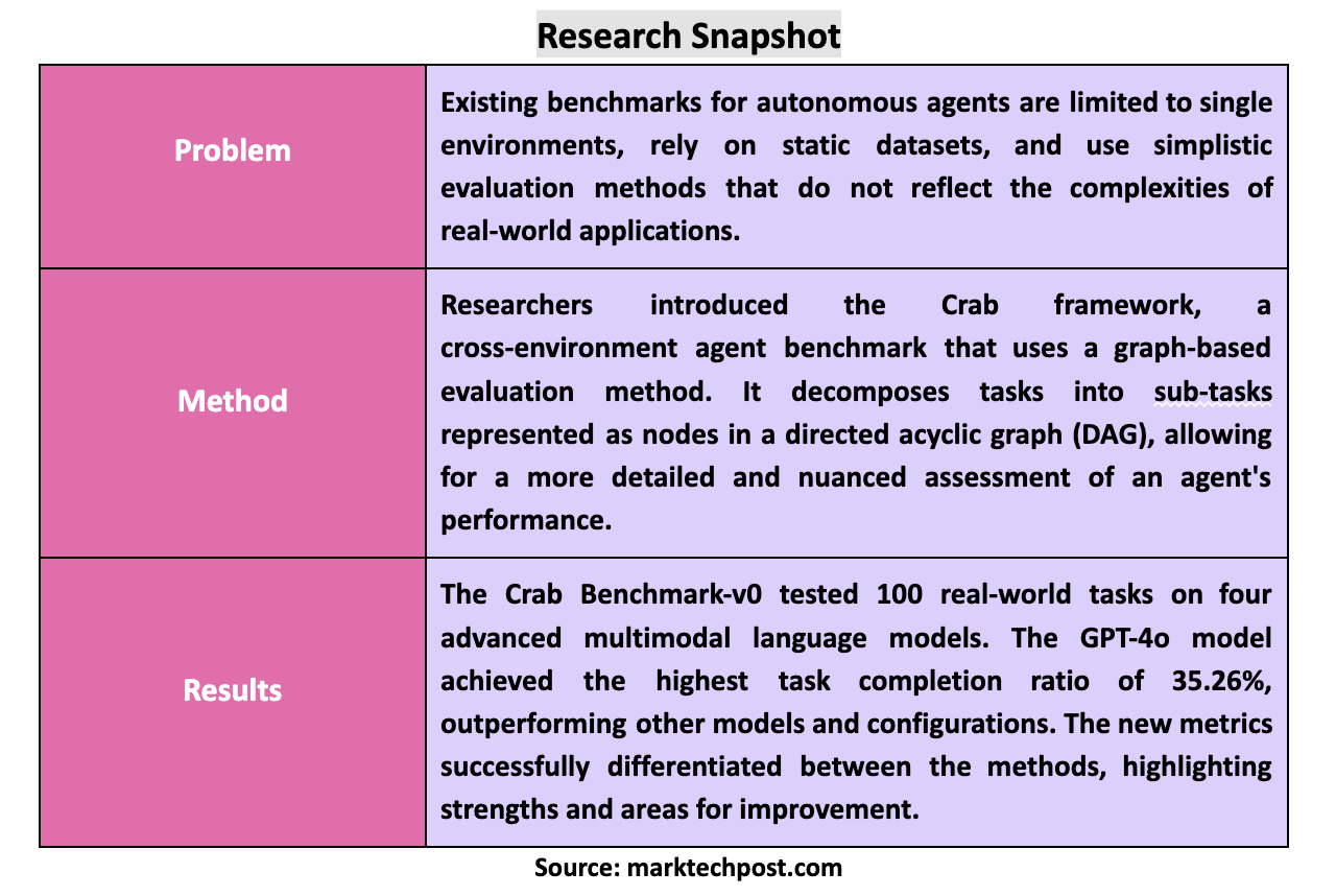 Researchers from KAUST, Eigent.AI, UTokyo, CMU, Stanford, Harvard, Tsinghua, SUSTech, and Oxford have developed the Crab framework, a novel benchmarking tool designed to evaluate cross-environment tasks. This framework stands out by supporting functions that span multiple devices and platforms, such as desktops and mobile phones, and by incorporating a graph-based evaluation method that offers a more detailed and nuanced assessment of an agent’s performance. Unlike traditional benchmarks, the Crab framework allows for the simultaneous operation of agents across different environments, making it more reflective of the complexities agents face in real-world scenarios.