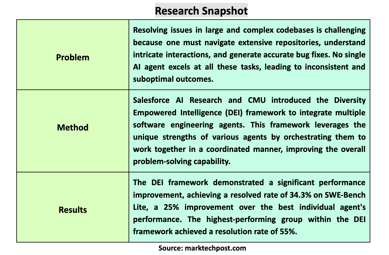 Researchers from the Salesforce AI Research team and Carnegie Mellon University proposed the Diversity Empowered Intelligence (DEI) framework. DEI is a framework designed to encompass multiple software engineering agents leveraging unique strengths toward a more unified, powerful, cohesive problem-solving entity. This framework functions as a meta-module applicable to existing SWE agents, allowing them to cooperate in a coordinated manner. In guiding and managing these collaborative efforts, DEI greatly improves the ability of all agents to solve complex software problems compared to any agent possibly doing it by itself.