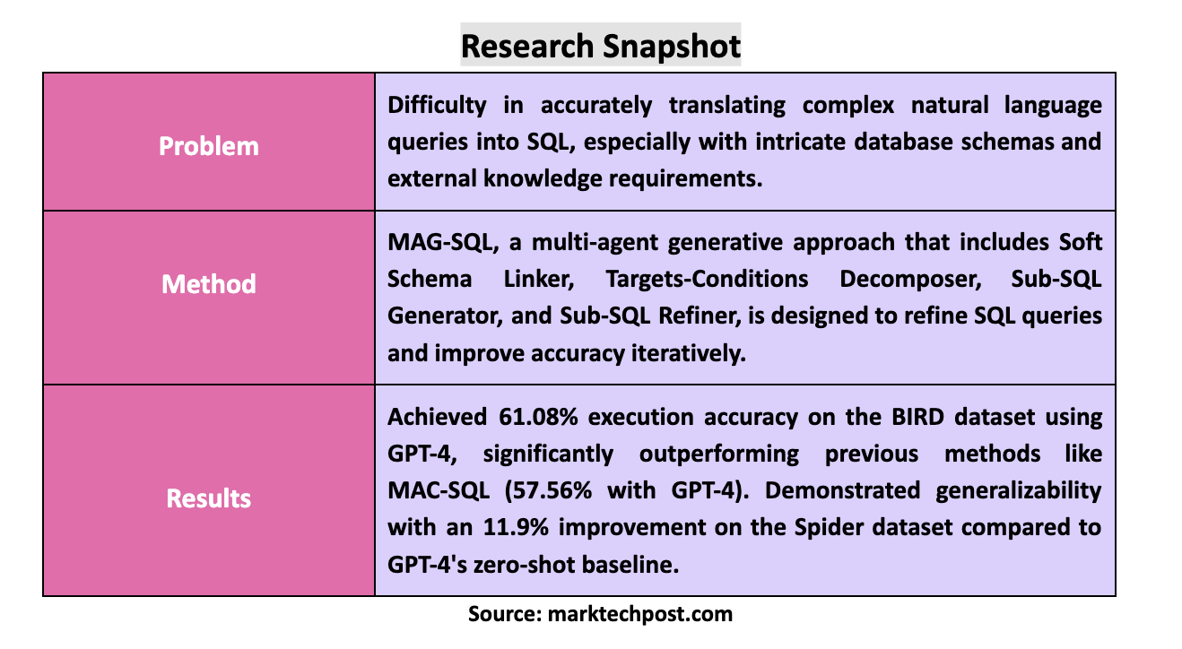 The post MAG-SQL: A Multi-Agent Generative Approach Achieving 61% Accuracy on BIRD Dataset Using GPT-4 for Enhanced Text-to-SQL Query Refinement appeared first on MarkTechPost.