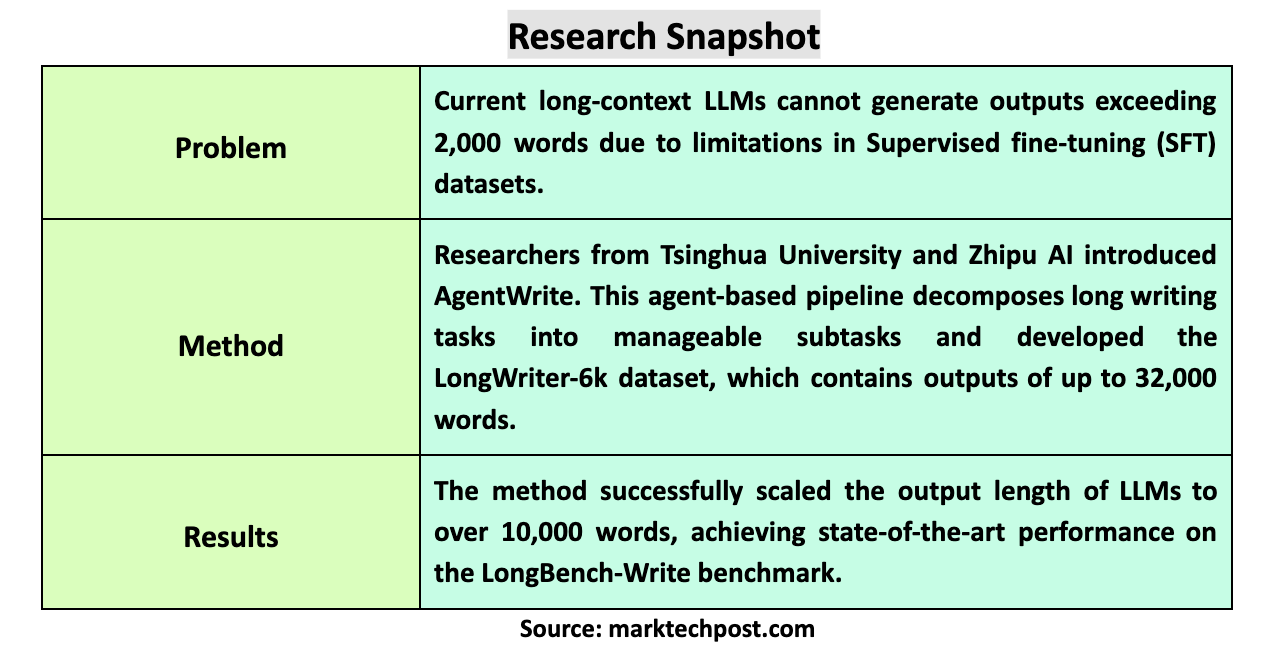 A Tsinghua University and Zhipu AI research team introduced an innovative solution known as AgentWrite. This novel agent-based pipeline is designed to decompose ultra-long writing tasks into smaller, more manageable subtasks, enabling existing LLMs to generate coherent outputs that exceed the 20,000-word mark. By breaking down the task, AgentWrite allows off-the-shelf models to manage and generate long-form content without compromising quality. This method represents a significant departure from traditional approaches that have attempted to stretch output length by merely fine-tuning existing short-output datasets.