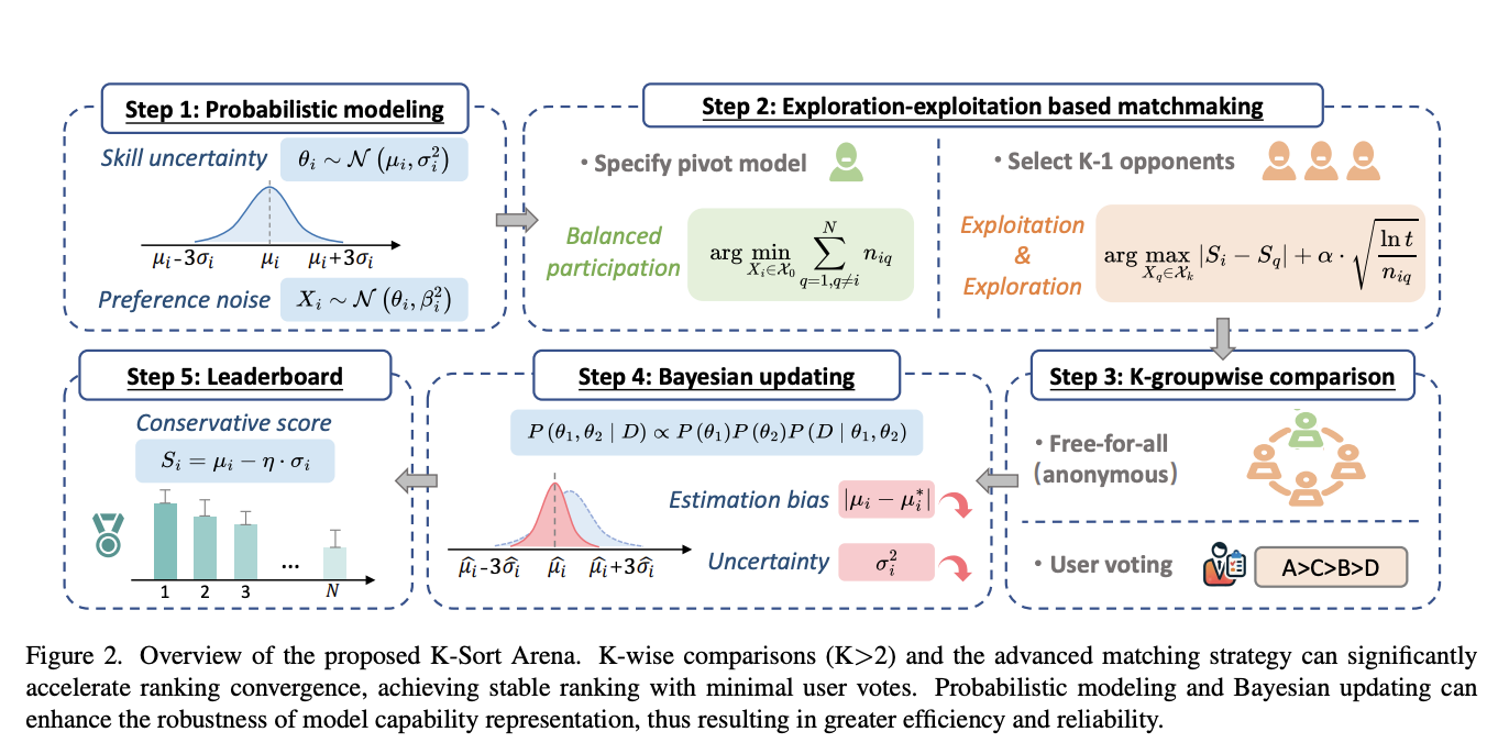 K-Sort Arena’s methodology consists of several key components. Instead of comparing just two models, K models (K>2) are evaluated simultaneously, providing more information per comparison. Model capabilities are represented as probability distributions, capturing inherent uncertainty and allowing for more flexible and adaptive evaluation. After each comparison, model capabilities are updated using Bayesian inference, incorporating new information while accounting for uncertainty. An Upper Confidence Bound (UCB) algorithm is used to balance between comparing models of similar skill (exploitation) and evaluating under-explored models (exploration). The key innovations of K-Sort Arena – K-wise comparisons, probabilistic modeling, and intelligent matchmaking – work together to provide a comprehensive evaluation system that better reflects human preferences while minimizing the number of comparisons required.