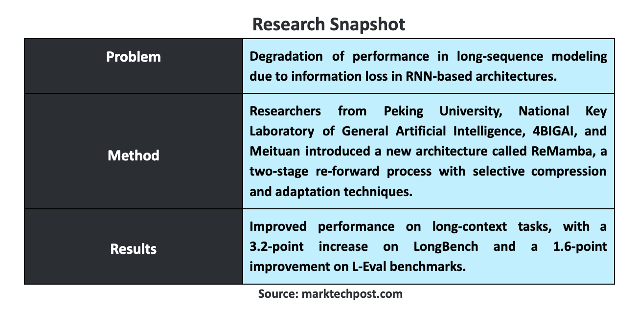 The post ReMamba: Enhancing Long-Sequence Modeling with a 3.2-Point Boost on LongBench and 1.6-Point Improvement on L-Eval Benchmarks appeared first on MarkTechPost.