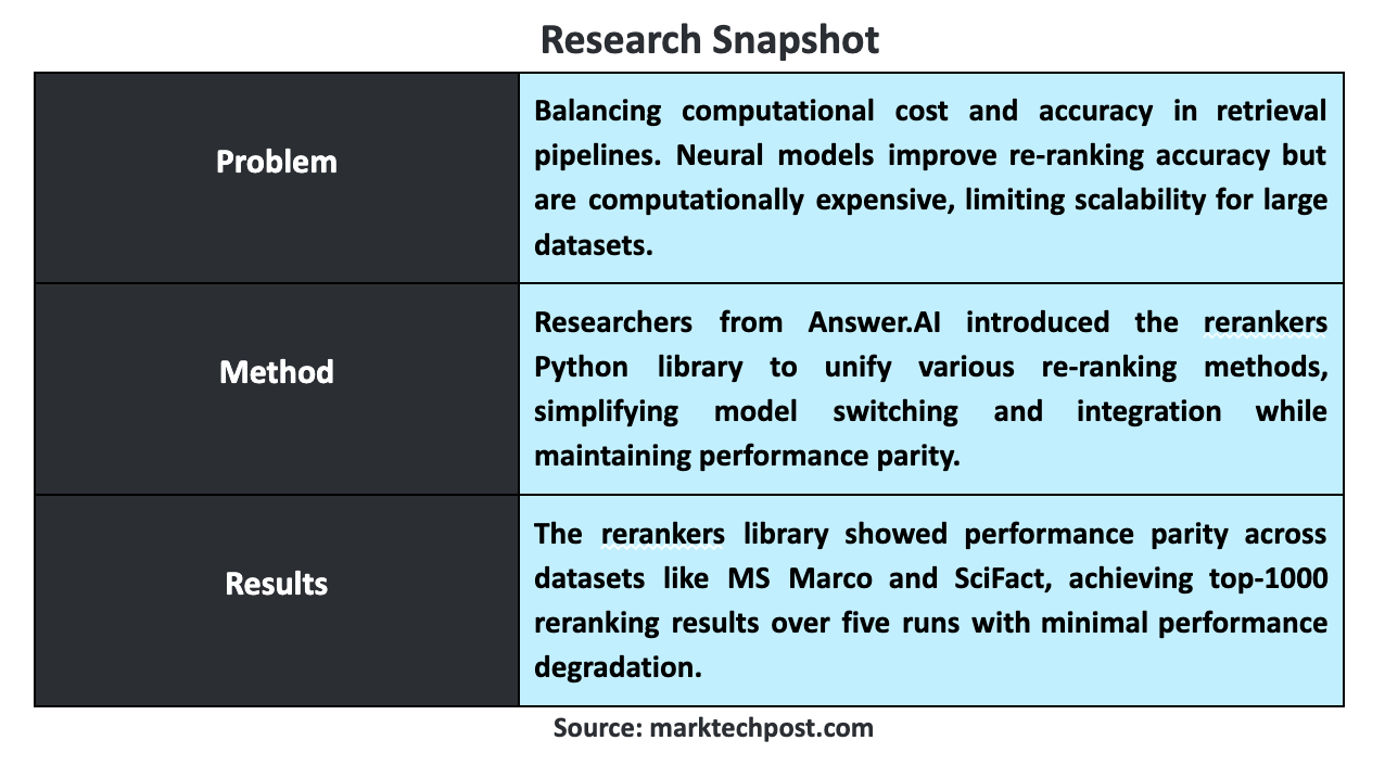 The post Answer.AI Releases ‘rerankers’: A Unified Python Library Streamlining Re-ranking Methods for Efficient and High-Performance Information Retrieval Systems appeared first on MarkTechPost.