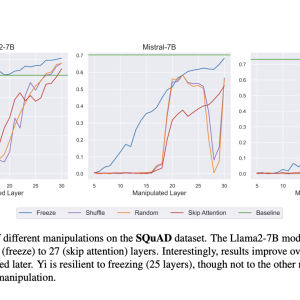 The researchers found that when these manipulations were applied to the top 30-50% of the model, performance across multiple tasks experienced little to no drop, suggesting that the top layers rely less on the hidden representations of previous tokens. For example, when freezing up to 50% of the layers, the models retained performance similar to that of the baseline. Additionally, swapping hidden states from different prompts further confirmed this observation; the model ignored changes made in the top layers, while changes in lower layers significantly altered the output. The experiments were conducted to understand whether attention was needed in the higher layers of the model by skipping the attention block in those layers. This test demonstrated that skipping attention in the upper layers had minimal impact on tasks like summarization and question answering, while doing so in lower layers led to severe performance degradation.