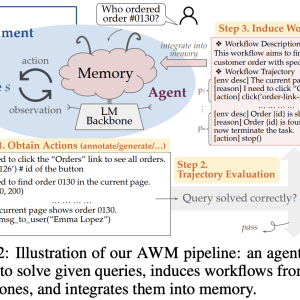 In detail, AWM works by analyzing the agent’s past experiences and extracting workflows from successful task completions. These workflows consist of goal-oriented routines stored in the agent’s memory for future use. For example, an agent might learn a basic workflow for finding a place by its name on a map. It can then build on this by learning more complex workflows, such as retrieving the ZIP code for the location. This memory-based approach allows the agent to adapt to increasingly complex tasks by leveraging previously learned workflows to inform future actions.