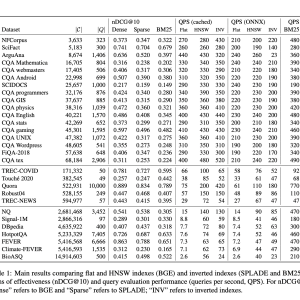 Traditionally, nearest-neighbor search is handled using three main approaches: HNSW indexes, flat indexes, and inverted indexes. HNSW indexes are commonly used for their efficiency and speed in large-scale retrieval tasks, particularly with dense vectors, but they are computationally intensive and require significant indexing time. Flat indexes, while exact in their retrieval results, become impractical for large datasets due to slower query performance. Sparse retrieval models, like BM25 or SPLADE++ ED, rely on inverted indexes and can be effective in specific scenarios but often lack the rich semantic understanding provided by dense retrieval models. The main limitation across these approaches is that none are universally applicable, with each method offering different strengths and weaknesses depending on the dataset size and retrieval