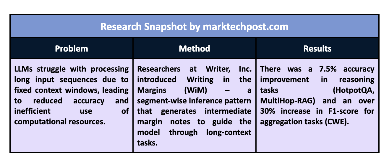 The post Writer Researchers Introduce Writing in the Margins (WiM): A New Inference Pattern for Large Language Models Designed to Optimize the Handling of Long Input Sequences in Retrieval-Oriented Tasks appeared first on MarkTechPost.