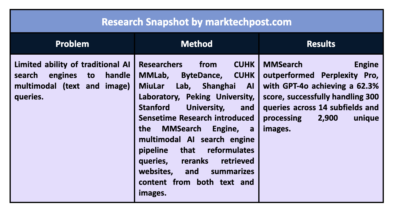 The post MMSearch Engine: AI Search with Advanced Multimodal Capabilities to Accurately Process and Integrate Text and Visual Queries for Enhanced Search Results appeared first on MarkTechPost.
