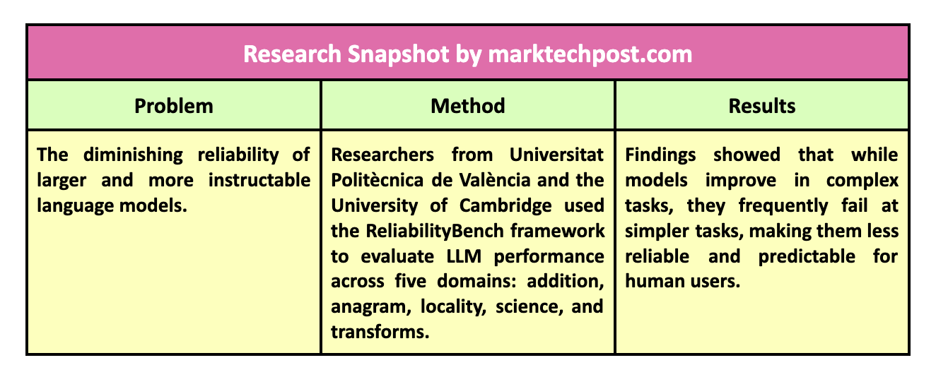The post ReliabilityBench: Measuring the Unpredictable Performance of Shaped-Up Large Language Models Across Five Key Domains of Human Cognition appeared first on MarkTechPost.