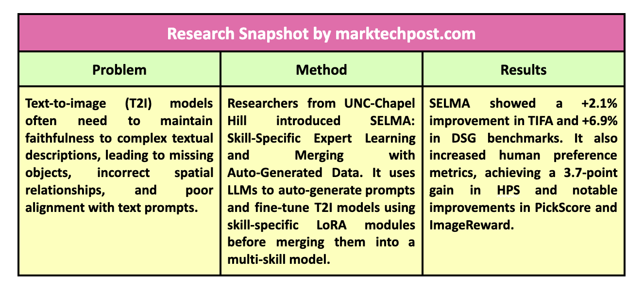 Researchers from the University of North Carolina at Chapel Hill have introduced SELMA: Skill-Specific Expert Learning and Merging with Auto-Generated Data. SELMA presents a novel approach to enhance T2I models without relying on human-annotated data. This method leverages the capabilities of Large Language Models (LLMs) to generate skill-specific text prompts automatically. The T2I models then use these prompts to produce corresponding images, creating a rich dataset without human intervention. The researchers employ a method known as Low-Rank Adaptation (LoRA) to fine-tune the T2I models on these skill-specific datasets, resulting in multiple skill-specific expert models. By merging these expert models, SELMA creates a unified multi-skill T2I model that can generate high-quality images with improved faithfulness and semantic alignment.