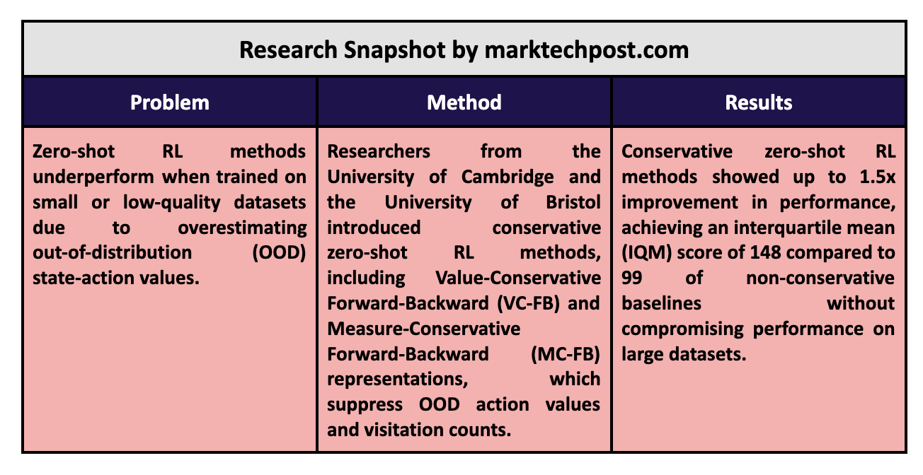 A research team from the University of Cambridge and the University of Bristol has proposed a new conservative zero-shot RL framework. This approach introduces modifications to existing zero-shot RL methods by incorporating principles from conservative RL, a strategy well-suited for offline RL settings. The researchers’ modifications include a straightforward regularizer for OOD state-action values, which can be integrated into any zero-shot RL algorithm. This new framework significantly mitigates the overestimation of OOD actions and improves performance when trained on small or low-quality datasets.
