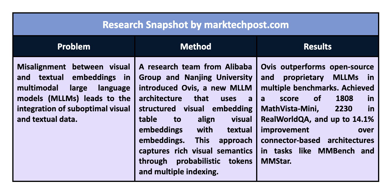 - Structural Alignment: Ovis introduces a novel visual embedding table that structurally aligns visual and textual embeddings, enhancing the model’s ability to process multimodal data.