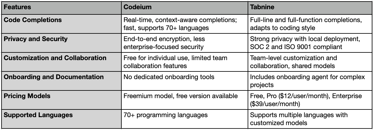 • Codeium is less privacy-centric but offers end-to-end encryption and data protection features, making it suitable for individual developers and smaller teams who don’t require enterprise-level security.