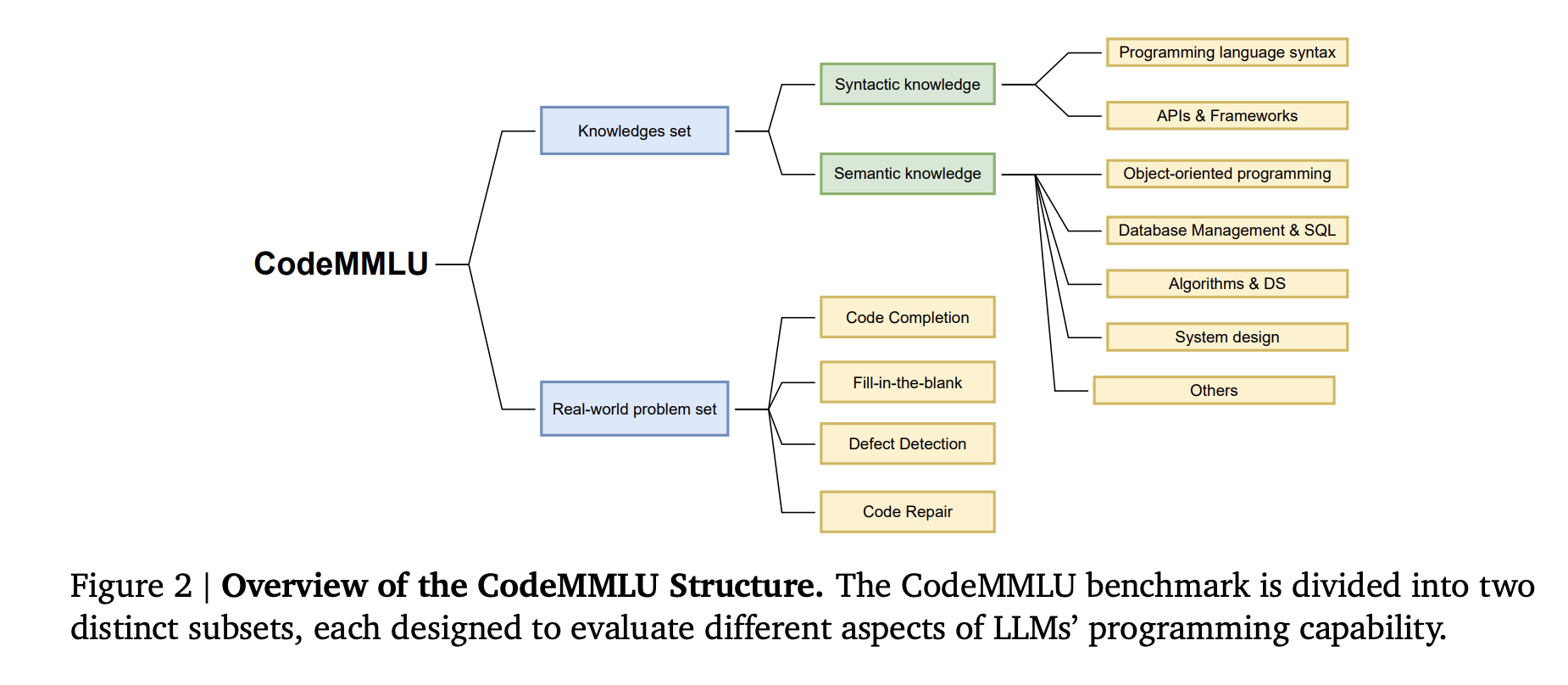 It is divided into two primary categories. First are knowledge-based test sets containing syntactic and semantic tasks, and second are real-world programming problems. The knowledge-based subset covers many topics, from high-level software principles concepts to low-level programming language grammar. Several programming-related MCQs are collected from high-quality platforms, like GeeksforGeeks W3Schools.