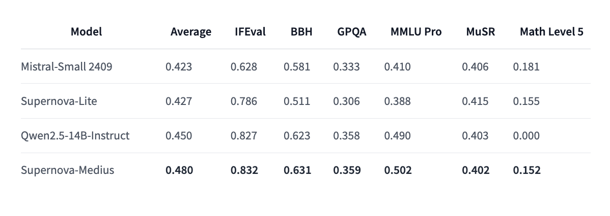 SuperNova-Medius excels in instruction-following (IFEval) and complex reasoning tasks (BBH), outperforming Qwen2.5-14B and SuperNova-Lite across multiple benchmarks. This makes it a powerful, efficient solution for high-quality generative AI applications.
