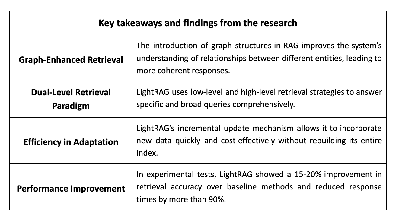 LightRAG combines detailed (low-level) and conceptual (high-level) information retrieval. Low-level retrieval retrieves specific entities and their attributes, ensuring precise and focused information. Meanwhile, high-level retrieval captures broader topics and themes, enabling the system to understand the bigger picture. This dual-level strategy allows LightRAG to answer complex queries by combining detailed and abstract information. Also, LightRAG includes an incremental update algorithm that facilitates real-time updates without reprocessing the entire database. This feature makes the system more responsive and capable of handling fast-paced changes in data, a vital capability in dynamic environments.