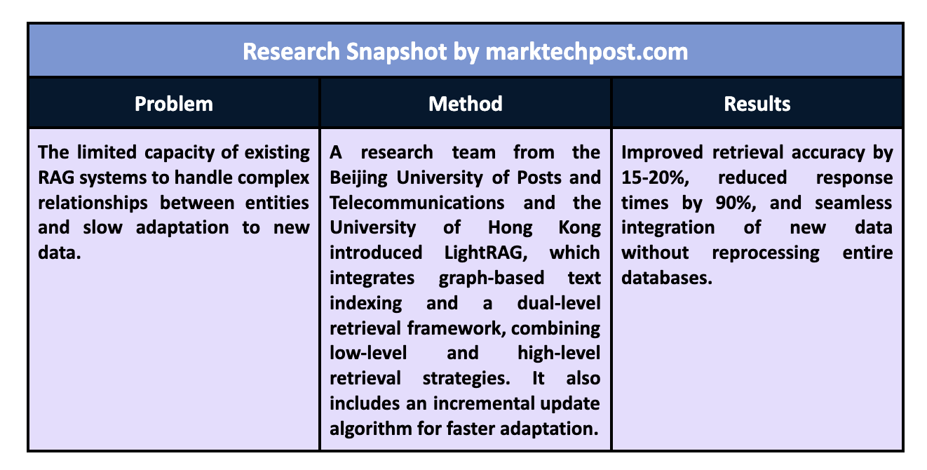 The post LightRAG: A Dual-Level Retrieval System Integrating Graph-Based Text Indexing to Tackle Complex Queries and Achieve Superior Performance in Retrieval-Augmented Generation Systems appeared first on MarkTechPost.