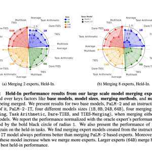 The researchers used fully fine-tuned expert models trained on specific tasks in their methodology. These were then merged to evaluate their performance on held-in tasks (tasks the experts were trained on) and held-out tasks (unseen tasks for zero-shot generalization). The merging techniques involved modifying task-specific parameters or using simple averaging to combine the models. PaLM-2-IT, the instruction-tuned variant of the base model, was used as a reference point to see if instruction-tuning improved the model’s ability to generalize after merging. This methodology allowed for a systematic analysis of the impact of model size, number of experts, and base model quality on merging success.