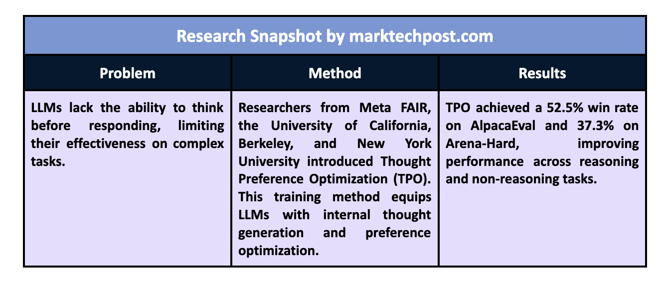 The effectiveness of TPO was tested on two prominent benchmarks: AlpacaEval and Arena-Hard. On AlpacaEval, the TPO model achieved a win rate of 52.5%, outperforming the direct response baseline by 4.1%. Similarly, it registered a win rate of 37.3% on Arena-Hard, outperforming traditional methods by 4.3%. These notable improvements demonstrate that TPO is effective in logic-based tasks and areas typically not associated with reasoning, such as marketing and health-related queries. The researchers observed that LLMs equipped with TPO showed gains even in creative writing and general knowledge tasks, indicating the broad applicability of the method.