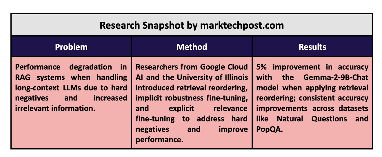 Researchers from Google Cloud AI and the University of Illinois introduced innovative methods to improve the robustness and performance of RAG systems when using long-context LLMs. Their approach encompasses training-free and training-based methods designed to mitigate the impact of hard negatives. One of the key innovations is retrieval reordering, a training-free method that improves the sequence in which the retrieved passages are fed to the LLM. The researchers propose prioritizing passages with higher relevance scores at the beginning and end of the input sequence, thus focusing the LLM’s attention on the most important information. Also, training-based methods were introduced to enhance further the model’s ability to handle irrelevant data. These include implicit robustness fine-tuning and explicit relevance fine-tuning, both of which train the LLM to discern relevant information better and filter out misleading content.