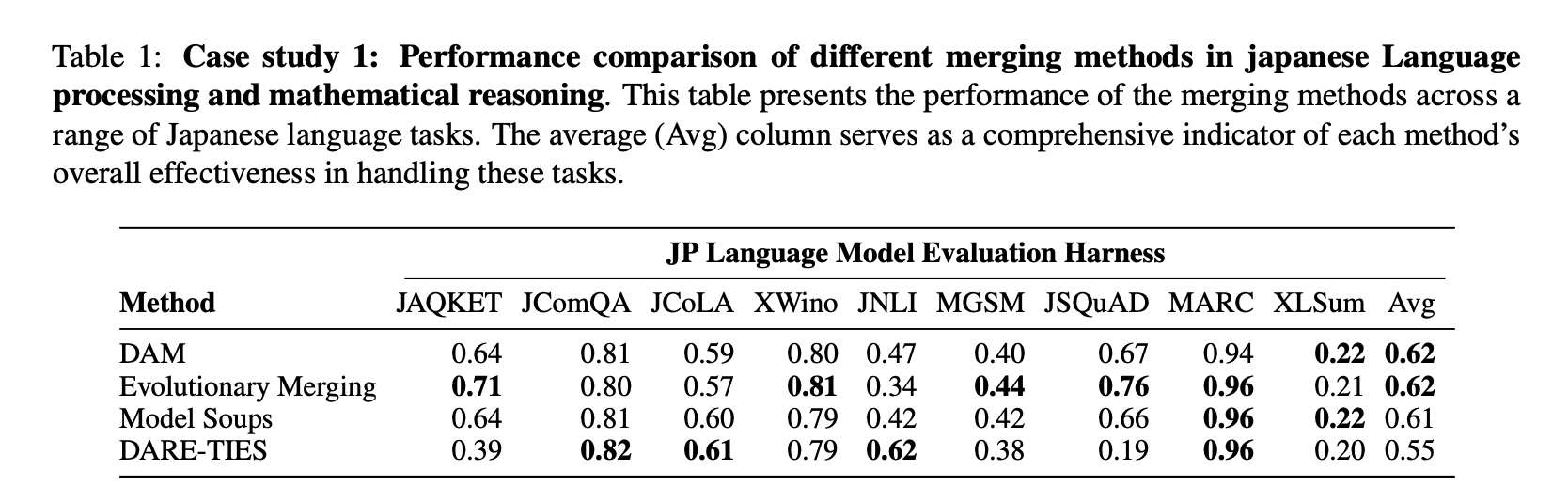 The researchers performed extensive experiments to compare DAM with other model merging methods. The evaluation was conducted across different model families, such as Mistral and Llama 3, and involved merging models with diverse capabilities, including multilingual processing, coding proficiency, and mathematical reasoning. The results showed that DAM not only matches but, in some cases, outperforms more computationally demanding techniques like Evolutionary Merging. For example, in a case study focusing on Japanese language processing and mathematical reasoning, DAM demonstrated superior adaptability, effectively balancing the specialized capabilities of different models without the intensive computational requirements of other methods. Performance was measured using multiple metrics, with DAM generally scoring higher or on par with alternatives across tasks involving language comprehension, mathematical reasoning, and structured query processing.