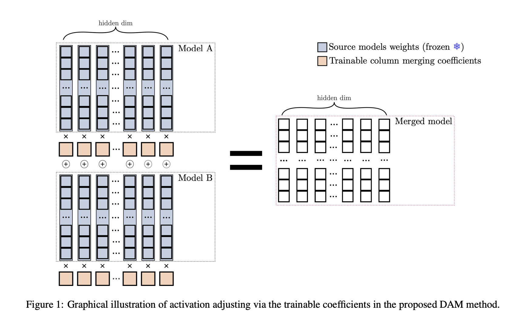 The core of DAM is its ability to merge multiple LLMs using a data-informed approach, which involves learning optimal scaling coefficients for each model’s weight matrix. The method is applicable to various components of the models, including linear layers, embedding layers, and layer normalization layers. DAM works by scaling each column of the weight matrices to balance the input features from each model, thus ensuring that the merged model retains the strengths of each contributing model. The objective function of DAM combines several components: minimizing Kullback-Leibler (KL) divergence between the merged model and the individual models, cosine similarity loss to encourage diversity in scaling coefficients, and L1 and L2 regularization to ensure sparsity and stability during training. These elements work in tandem to create a robust and well-integrated merged model capable of handling diverse tasks effectively.