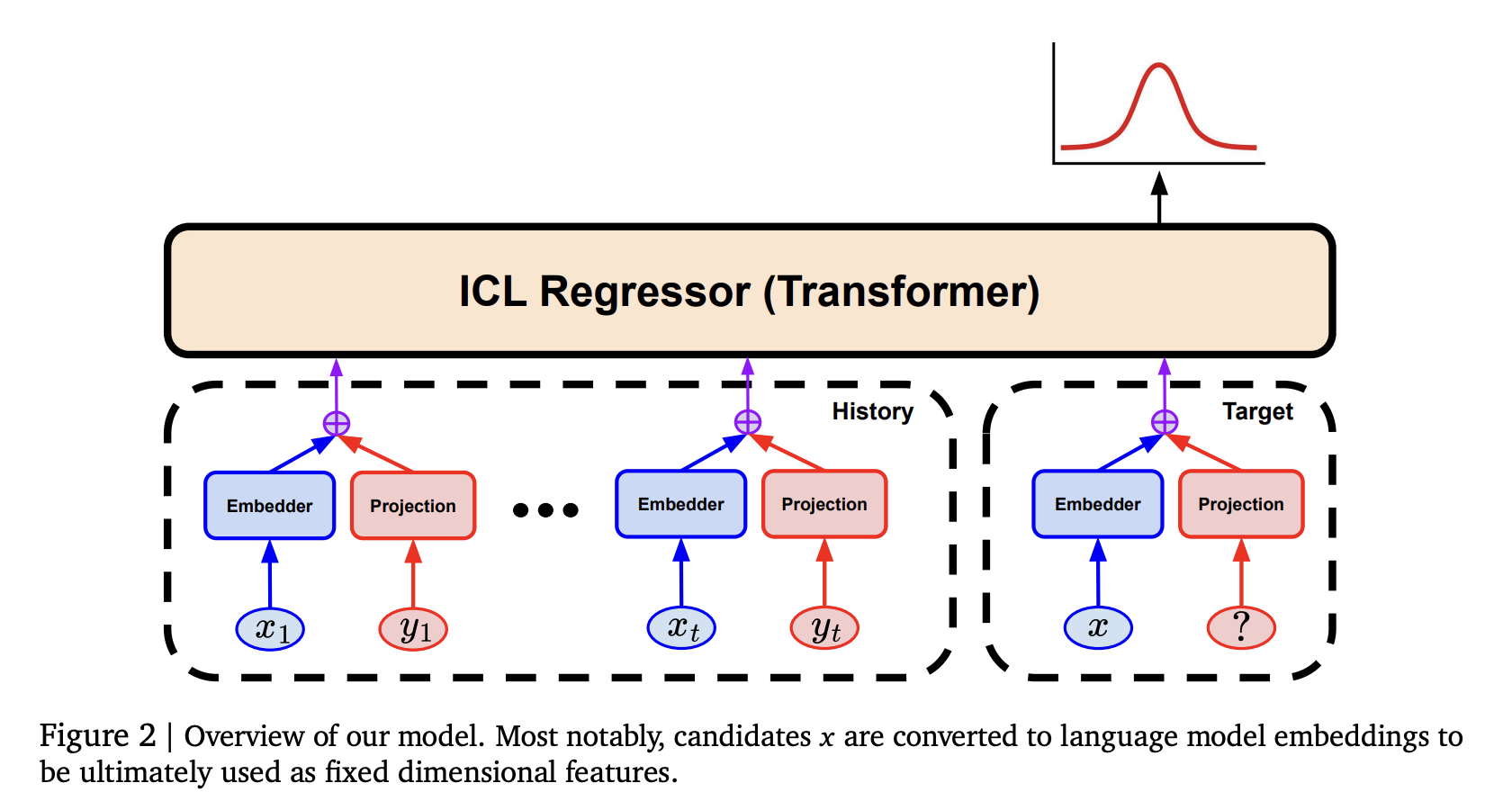The method uses an embedding-based regressor for Bayesian optimization, mapping string inputs to fixed-length vectors via a language model. These embeddings are processed by a Transformer to predict outcomes, forming an acquisition function to balance exploration and exploitation. The model, pretrained on offline tasks, uses historical data to make uncertainty-aware predictions. During inference, a mean and deviation output guides optimization. The approach is computationally efficient, using a T5-XL encoder and a smaller Transformer, requiring moderate GPU resources. This framework achieves scalable predictions while maintaining a low inference cost through efficient Transformers and embeddings.