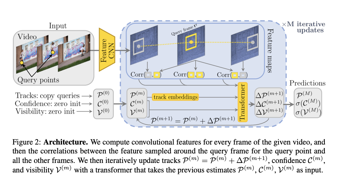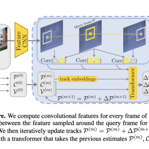 For training, the dataset consisted of around 100,000 videos. Next, multiple teacher models were trained on synthetic data. Then, a teacher is randomly chosen for training, and query points are selected from some video frames using the SIRF detection sampling method. Further delving into the technical details for each frame, convolutional networks are employed to extract feature maps and calculate the correlation between these feature vectors. This 4D correlation calculation is done with an MLP. A transformer iteratively updates values of Visibility and Confidence earlier initialized at 0.