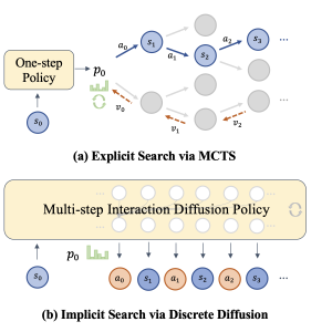 In conclusion, the paper presents DIFFUSEARCH, a model that shows the potential shift from explicit search on one-step policies to implicit search within future-aware policies in the chess domain. DIFFUSEARCH outperforms both searchless policies and those enhanced by explicit search methods, as evidenced by experiments and analyses. The principles and techniques developed in this controlled task can be applied to natural language settings, improving current next-token prediction in LLMs. However, DIFFUSEARCH depends on an oracle (Stockfish) for future supervision, and integrating it with self-play techniques could be an exciting direction for future work. Also, the model’s search depth is limited by context length, so, adopting long-context models could enable more efficient training and deeper searches.